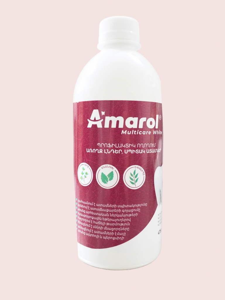Amarol Multicare White ողողման հեղուկը նախատեսված է ամենօրյա օգտագործման համար։ Ի տարբերություն շուկայում առկա ողողման հեղուկների, այն չի պարունակում քիմիական հակաբակտերիալ նյութեր (chlorhexidine, cetylpyrinidium chloride), որոնք կարող են գունավորել ձեր ատամները երկարատև օգտագործման դեպքում։ Փոխարենը օգտագործվում է իրենց արդյունավետությունը ապացուցած ուրցի, էվկալիպտի և անանուխի մեջ առկա բաղադրիչների համակցությունը։ Ողողումը նաև օգնում է կանխել ատամնաքարի գոյացումը, ինչպես նաև ամրացնում է ատամների էմալը։ Amarol ողողման հողուկները չեն պարունակում հավելյալ գունանյութեր, ի տարբերություն շուկայում առկա կապույտ, կանաչ և կարմիր գույնի հեղուկների։